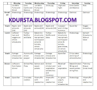 Here is my meal plan!  This is something I share with my customer and challenge groups each week.  A big part of my program is planning.  You cannot be successful until you have a focus.  This plan gives you a starting point.  When you know what you are eating each night it takes the guess work out.  You know that you have something in mind already and there is no room for the common excuse “I don’t know what to make so lets just eat out”.